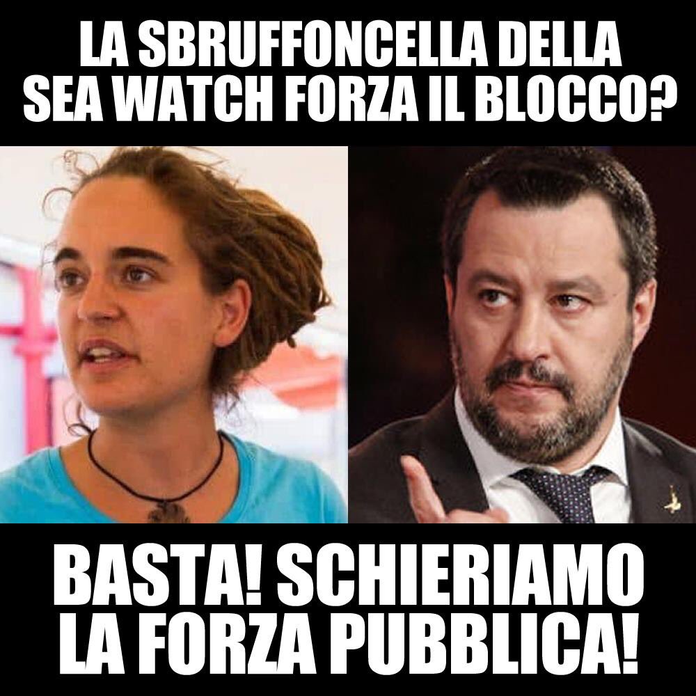 #SALVINI: "LA SBRUFFONCELLA DELLA SEA WATCH FORZA IL BLOCCO? BASTA! SCHIERIAMO LA FORZA PUBBLICA" ++pic.twitter.com/W5WnTyJA9U