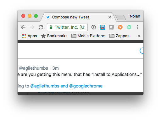 If you follow the 3 tweets in that thread, it gives instructions. If you follow them, the "Install to Applications..." will be in the menu that shows when you click the 3 vertical dots (top right of Chrome window)https://twitter.com/NolanOBrien/status/974781203399110656 …