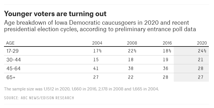 #IACaucus turnout is similar to 2016, BUT the electorate skews younger. 8 percentage points increase of the share of the under 45 group from two years ago (now at 45 percent). That should be not so good for Biden.#IowaCaucusespic.twitter.com/gY915O9sxw