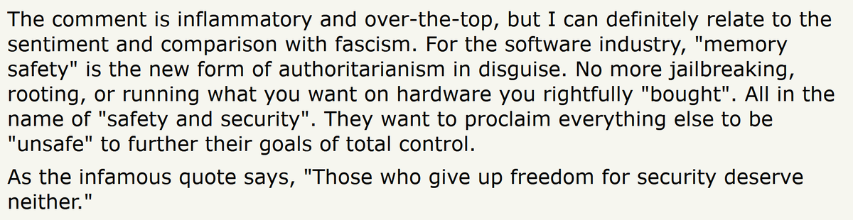 wow. i mean, there's a level of truth here - software companies that are evil will be better at being evil if their tools are better - but holy moly, the answer to that is not "build worse tools"!https://twitter.com/pcwalton/status/1406811169822711809 …