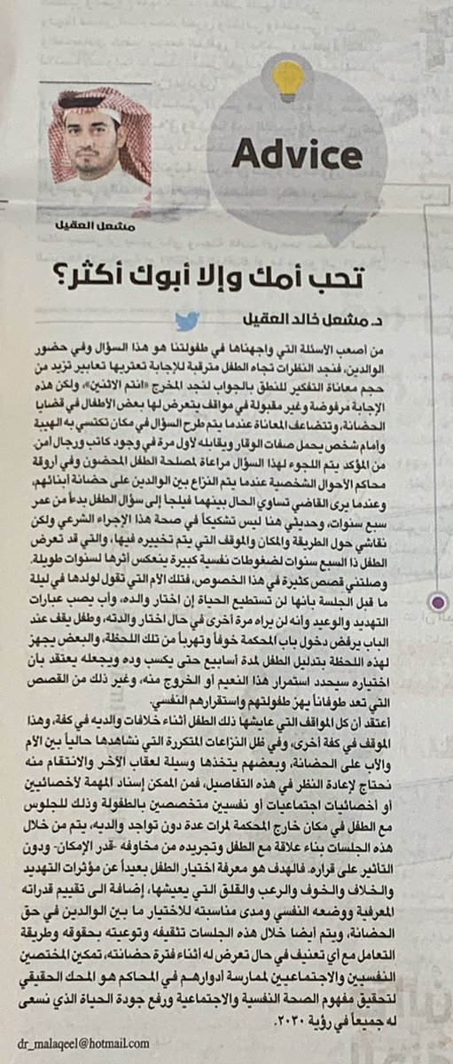 #مشعل_العقيل على عكاظ في الصفحة الثامنة والخاصة بالصحة النفسية، بعنوان : " تحب أمك وإلا أبوك أكثر؟" (أعتقد أن كل المواقف التي عايشها ذلك الطفل أثناء خلافات والديه في كفة، وهذا الموقف في كفة أخرى).#مقالات_عكاظ@AlaqeelMe https://www.okaz.com.sa/specialized-corners/na/2008124 …pic.twitter.com/Pywf4FYkmR
