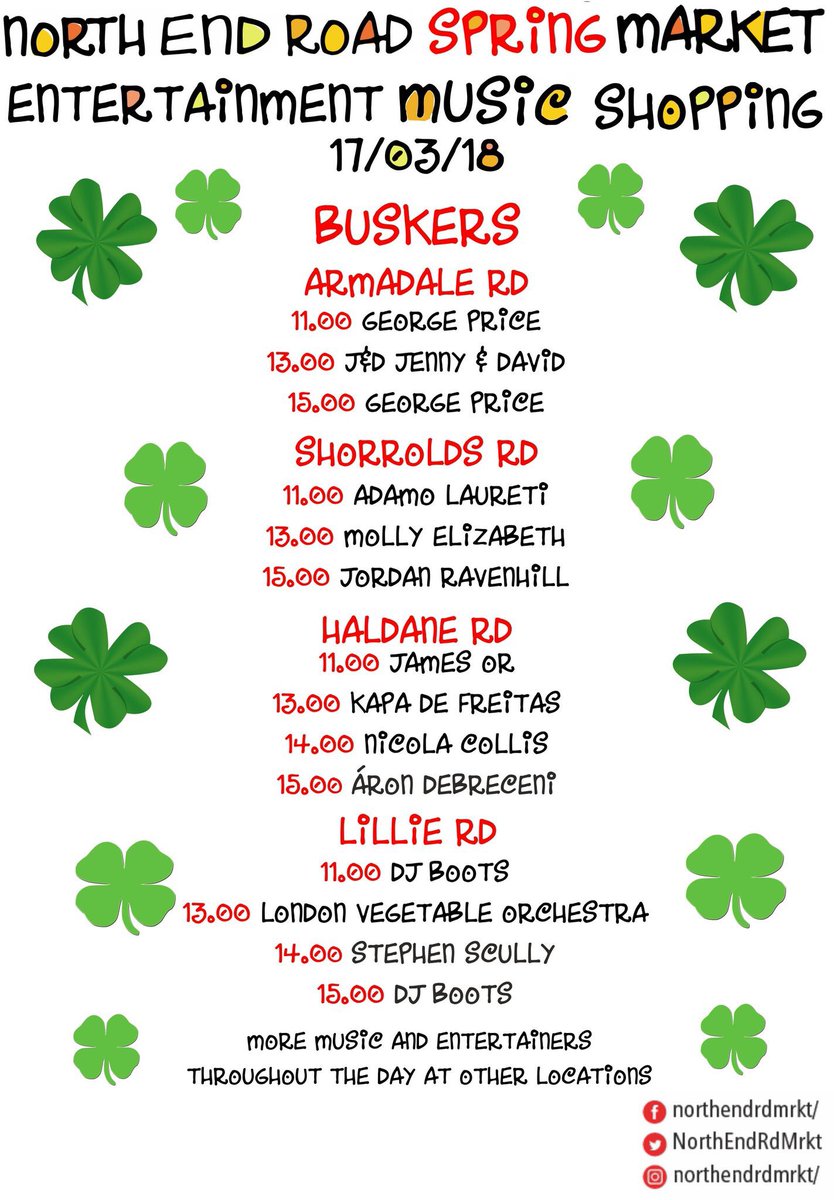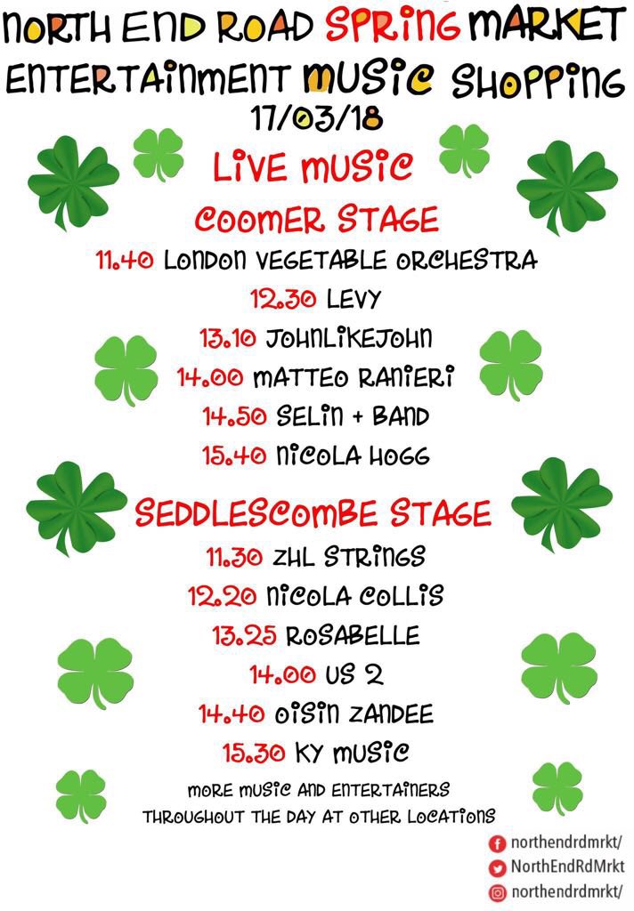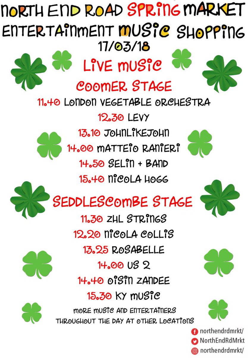 Vital information for today's North End Road Spring Market Festival 17/03/18: music, street food, entertainment & 150 + market stalls.