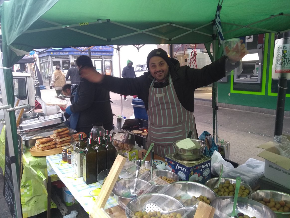 Saturday regular Apostolos with his greek olives and specialities at the Spring Market.