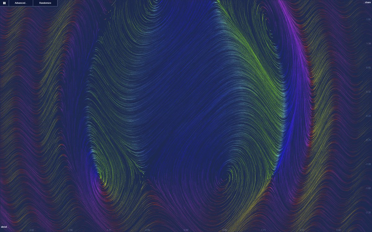 Fieldplay: https://goo.gl/u25s8p A relaxing 2D vector field visualization. Click 'randomize' to cycle through different vector fields, or write your own.pic.twitter.com/z2FMfaRRDx