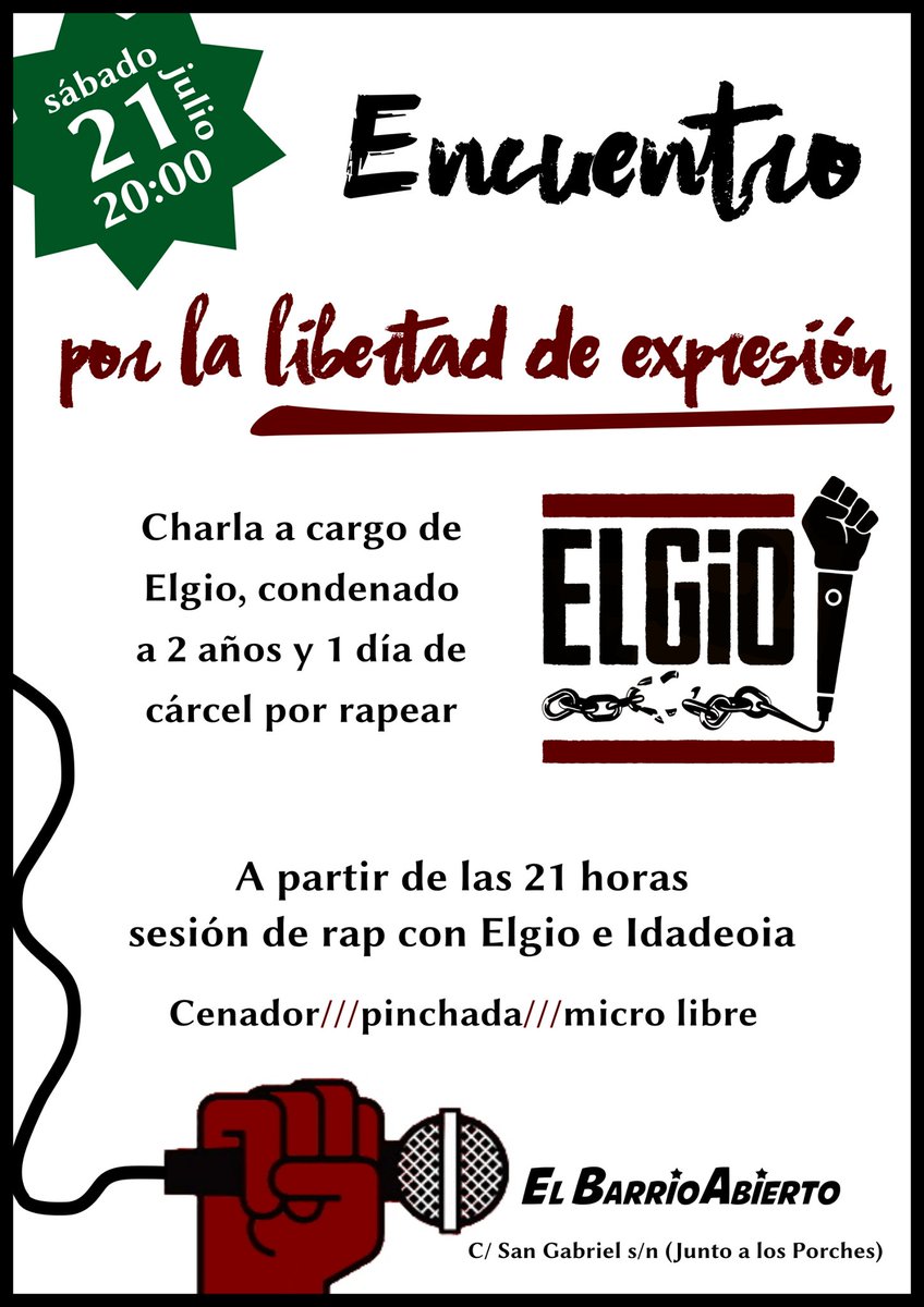 Aquest cap de setmana estarem a Andalusia per apropar el cas de l'@Elgio_ne a aquesta estimada terra de lluita i dignitat. Dissabte farem xerrada i concert a#Cadiz, a El Barrio Abierto.#CulpablesPerCantarpic.twitter.com/767lXp199B