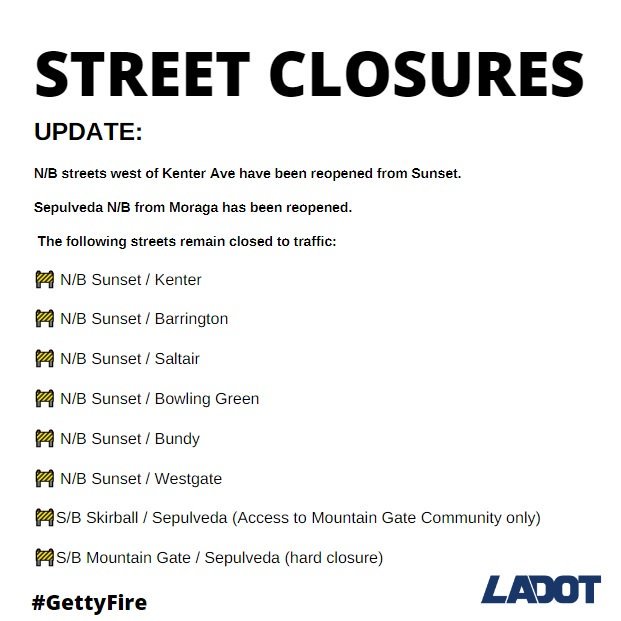 #GettyFire road closure update. N/B streets west of Kenter have been reopened to traffic. Kenter and streets eastward remain closed north of Sunset. Sepulveda N/B has been reopened at Moraga. Full list of closures:@readyLA@LAPDHQ@LAFDTalk@MikeBoninLA@MayorOfLA@PaulKoretzCD5pic.twitter.com/RPTg4S9n23
