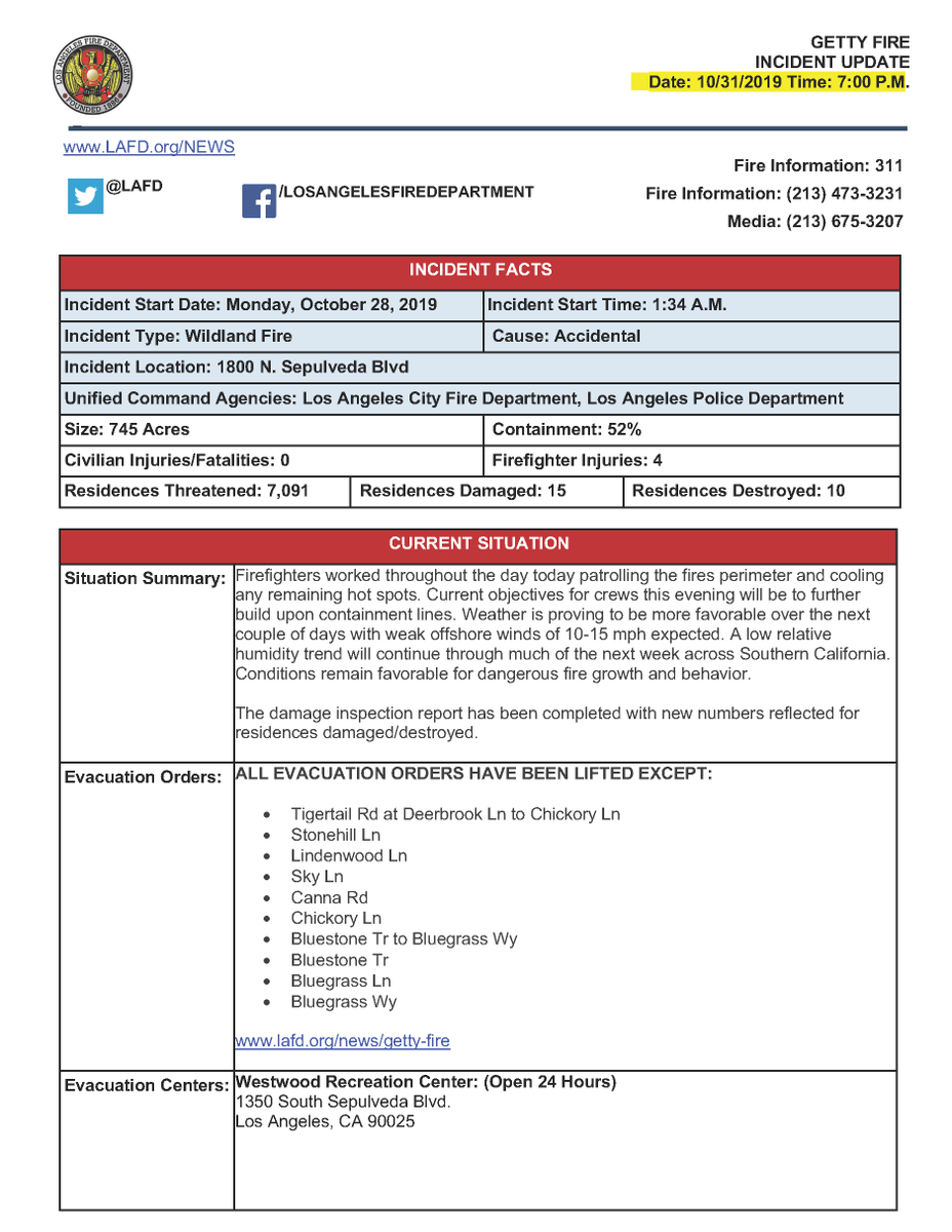 #GettyFire Update as of 7:00PM October 31, 2019 For all details, please visit http://www.lafd.org/news/getty-fire pic.twitter.com/ng4zPSLpsq