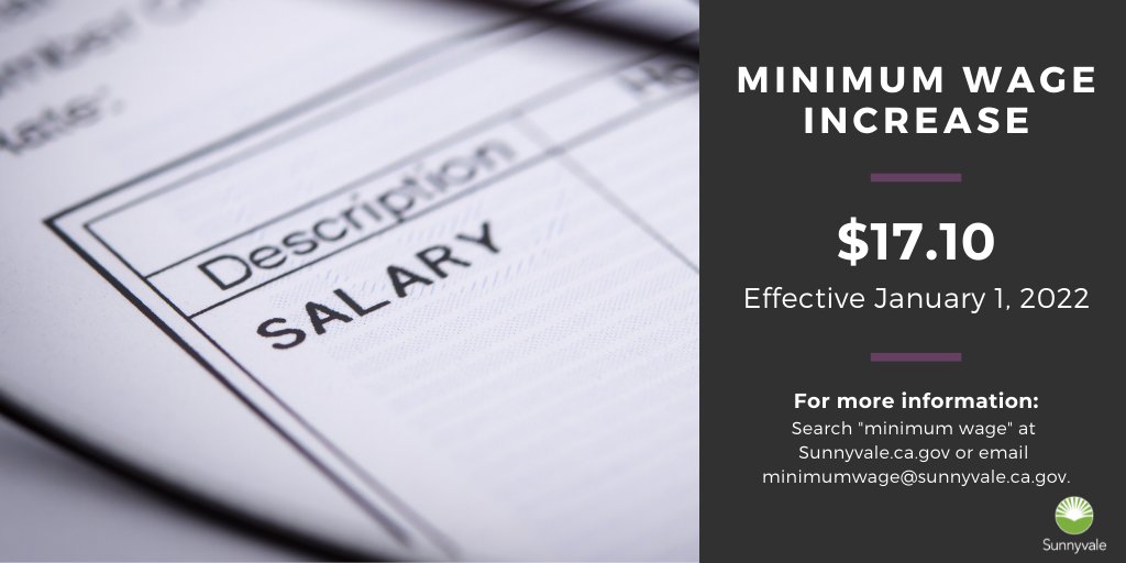 The minimum wage rate in Sunnyvale will increase to $17.10 per hour effective Jan. 1, 2022. This follows the schedule adopted in 2016 which adjusts the minimum wage with the Consumer Price Index.