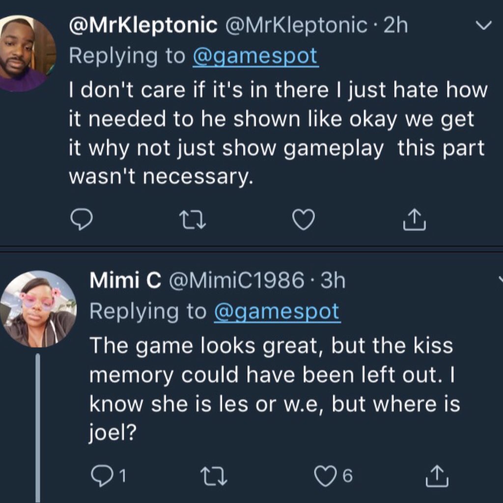 I can get where like one of these guys is coming from, wanting to know about Joel and all that. Rest are just trolling/being asses, as it usually goes in chats or responses about anything being shown ever. Kinda sad, game's looking REALLY good, regardless of what they complain.