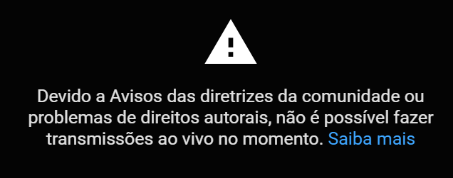 Preciso de ajuda com um aviso aplicado de maneira incorreta no meu canal, agora não estou conseguindo transmitir ao vivo @YouTubeBrasil @TeamYouTube @youtubepic.twitter.com/mBb6pI58hO