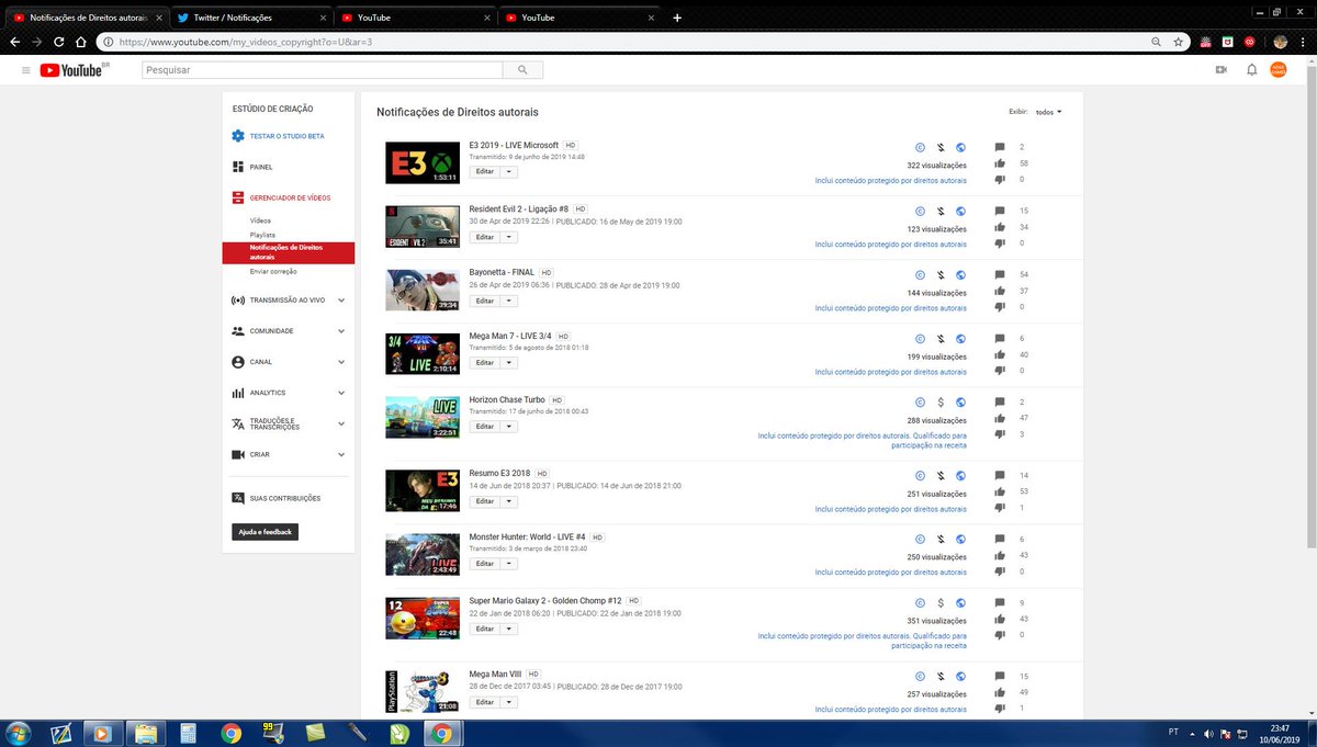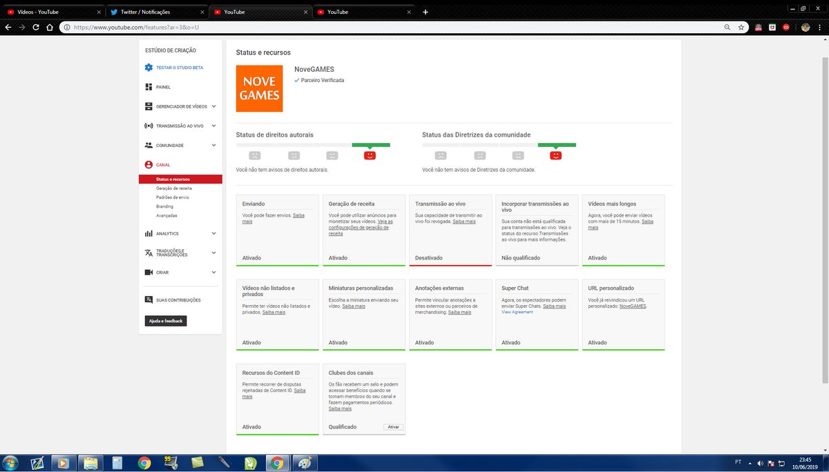 Olá! Gostaríamos de ajudar. Poderia nos eviar uma captura de tela completa da página "Status e recursos" e também da Guia "Notificações de Direitos autorais": http://yt.be/help/QcXK ? Aguardamos aqui.