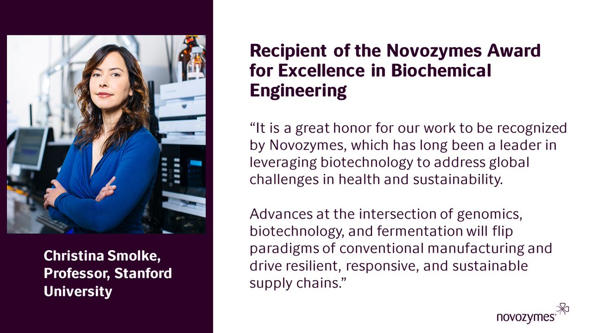 The Novozymes Award for Excellence in Biochemical Engineering goes to Christina Smolke, professor at Stanford University, who has pioneered the production of complex plant products using yeast-based fermentation. Learn more about Christina's research: https://tilmeld.events/novozymesaward pic.twitter.com/5awYHizF6y