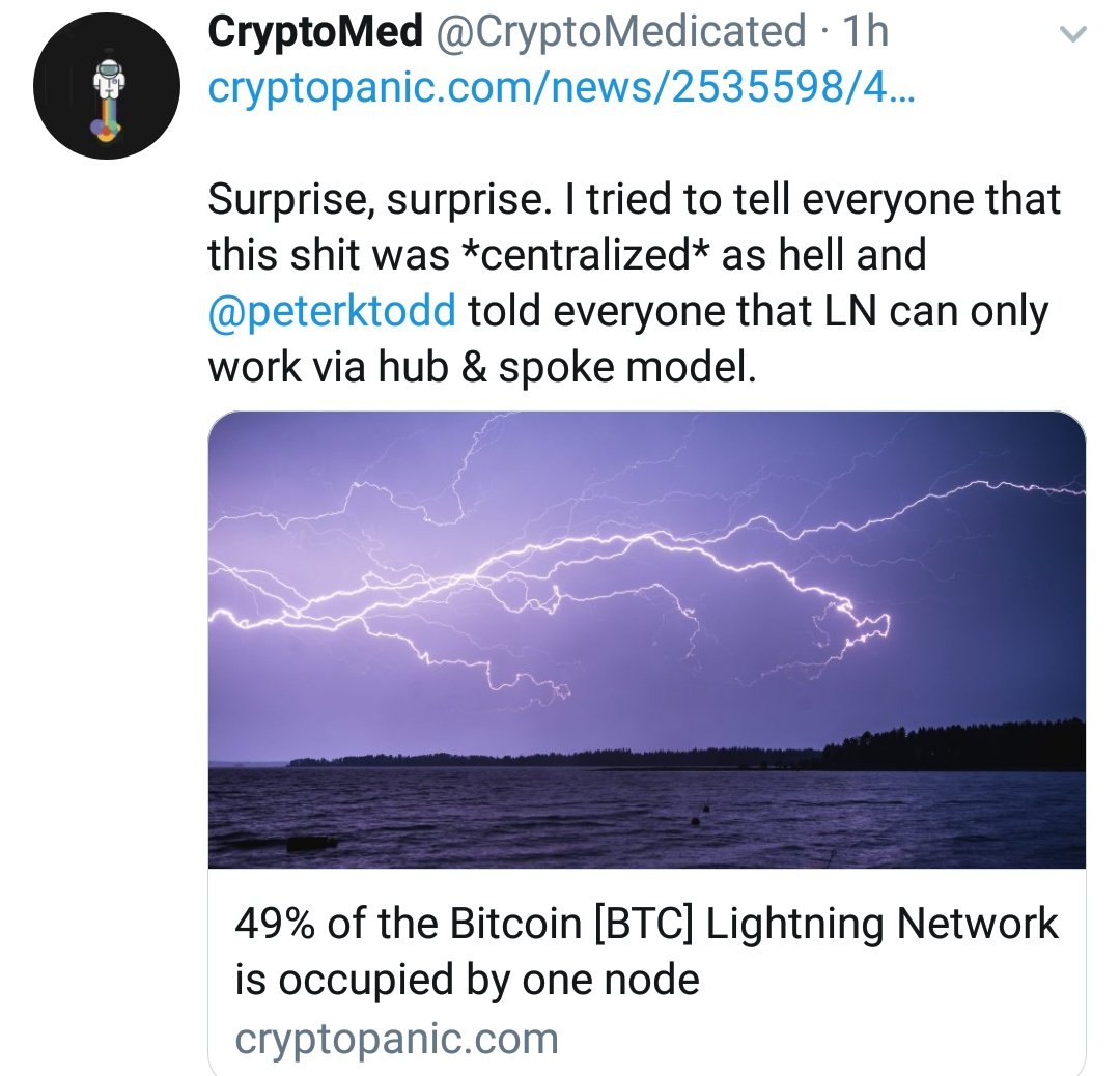 So you know that massive capacity lightning node setup by a guy who hates Lightning and promotes Bcash? Sure enough it's getting used for FUD. Dumb FUD too: you can't centralize a thing used voluntarily solely by running a big node. Just means you're wasted a bunch of money.pic.twitter.com/Ni4uLixNI3