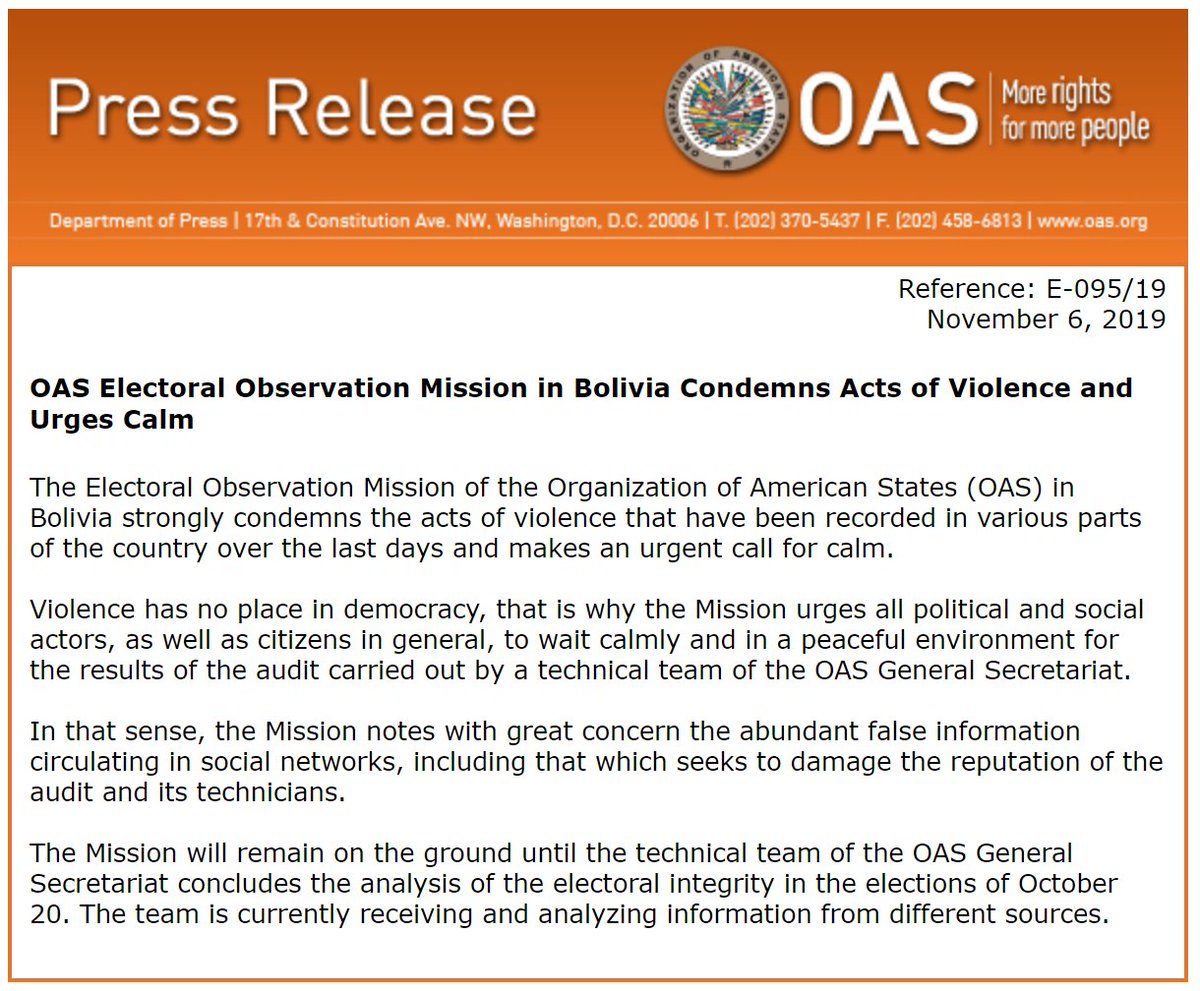 #OEAenBolivia#OAS Electoral Observation Mission in Bolivia Condemns Acts of Violence and Urges Calm http://bit.ly/2PThK1z pic.twitter.com/JfBpoNonWD