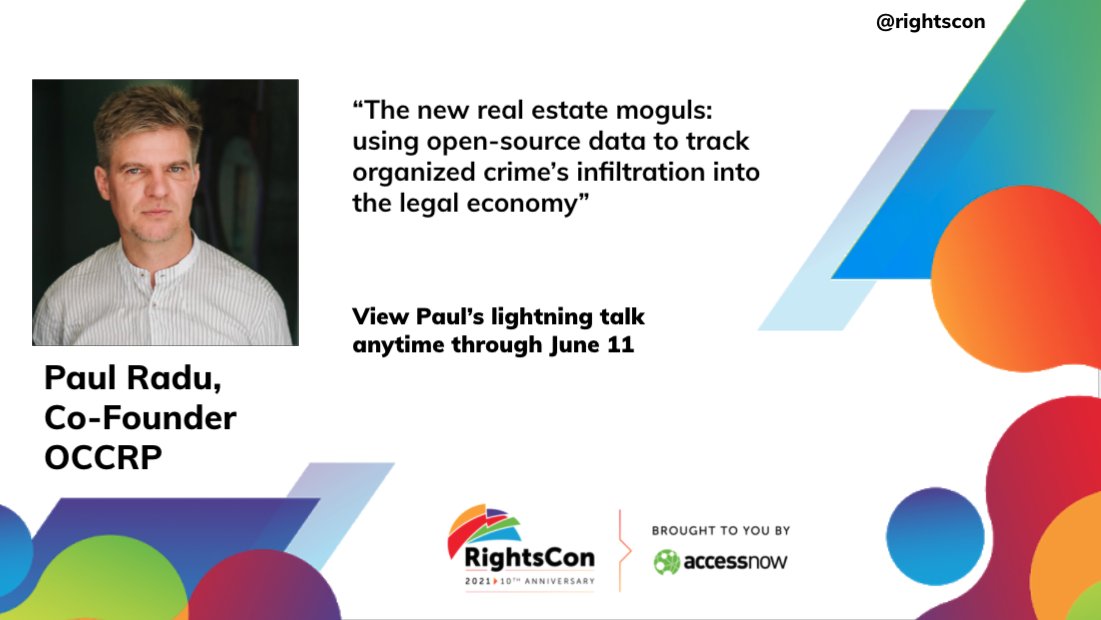 @rightscon? Don’t miss Paul Radu's (@IDashboard) lightning talk: "The new real estate moguls: using open-source data to track organized crime’s infiltration into the legal economy." RightsCon participants can access Paul's talk anytime through June 11.pic.twitter.com/ghll8r9BHJ