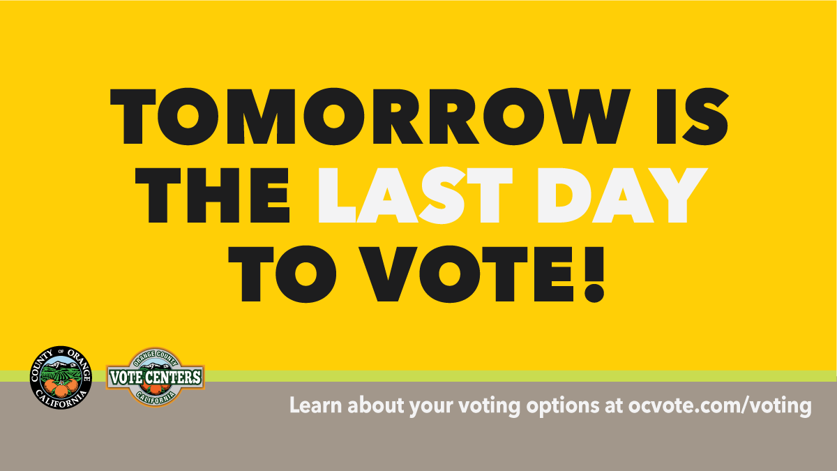 Tomorrow is the LAST day to vote! Avoid crowds, vote at home or at a Vote Center today. Mail ballots must be postmarked by tomorrow. For the full schedule and locations, visit http://ocvote.com/votecenter