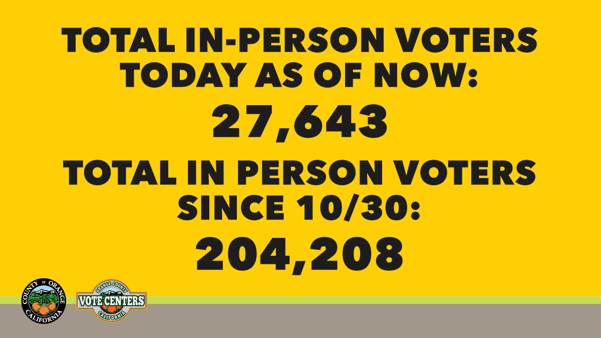 As of 11 AM today, 27,643 voters have voted at a Vote Center in Orange County. Since in-person voting started on 10/30, 204,208 voters have taken care of their voting needs at a Vote Center. Visit http://ocvote.com/votecenter