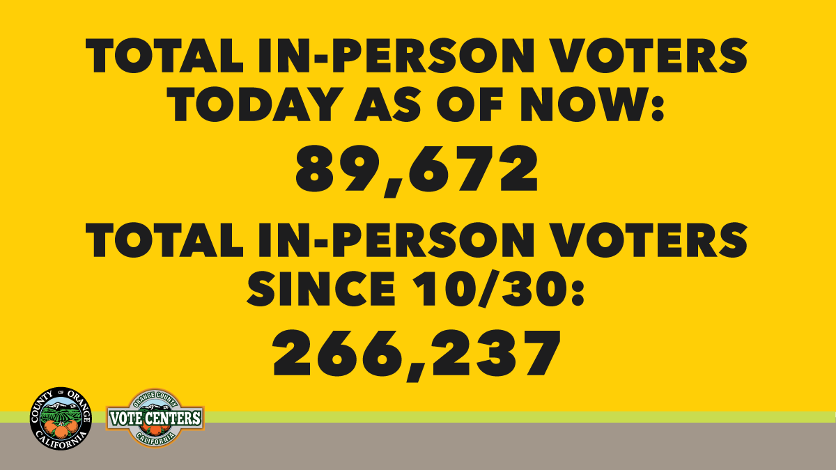 As of 8 PM today, 89,672 voters have voted at a Vote Center in Orange County. Since in-person voting started on 10/30, 266,237 voters have taken care of their voting needs at a Vote Center. Visit http://ocvote.com/votecenter