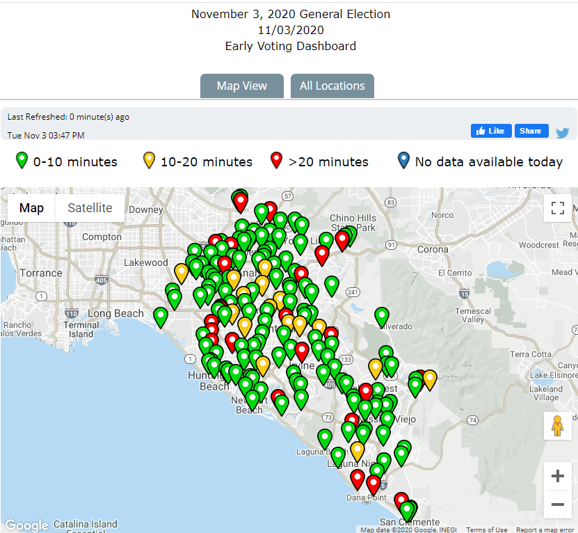 As of 3 PM today, 54,538 voters have voted at a Vote Center in Orange County. Since in-person voting started on 10/30, 226,548 voters have taken care of their voting needs at a Vote Center. Visit http://ocvote.com/votecenter