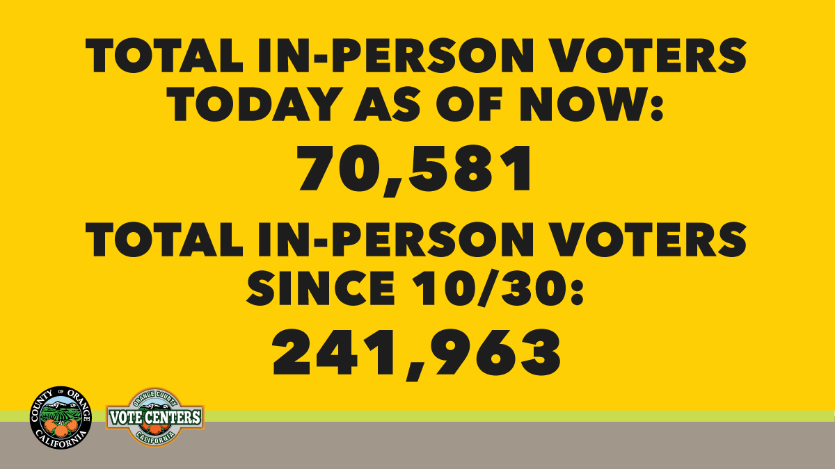 As of 5 PM today, 70,581 voters have voted at a Vote Center in Orange County. Since in-person voting started on 10/30, 241,963 voters have taken care of their voting needs at a Vote Center. Visit http://ocvote.com/votecenter