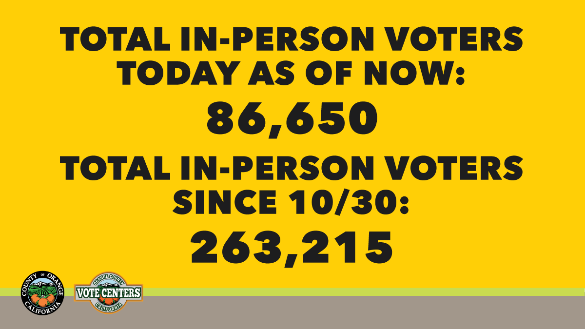 As of 7 PM today, 86,650 voters have voted at a Vote Center in Orange County. Since in-person voting started on 10/30, 263,215 voters have taken care of their voting needs at a Vote Center. Visit http://ocvote.com/votecenter