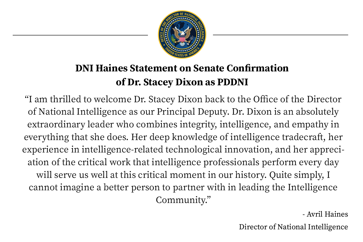 DNI Haines statement on Senate confirmation of Dr. Stacey Dixon as Principal Deputy Director of National Intelligence. Read the full statement here: https://www.dni.gov/index.php/newsroom/press-releases/press-releases-2021/item/2231-dni-haines-statement-on-senate-confirmation-of-dr-stacey-dixon-as-principal-deputy-director-of-national-intelligencei …pic.twitter.com/lBMbCp6Gj7