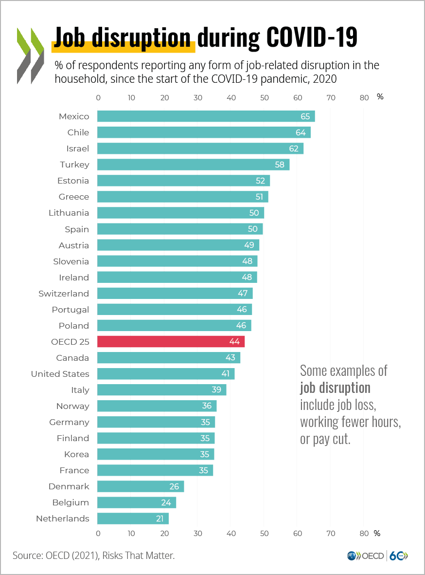 % of respondents to OECD’s #RisksThatMatter survey have experienced job-related disruption, such as • Job loss • Use of job retention scheme • Reduced working hours • Pay cut