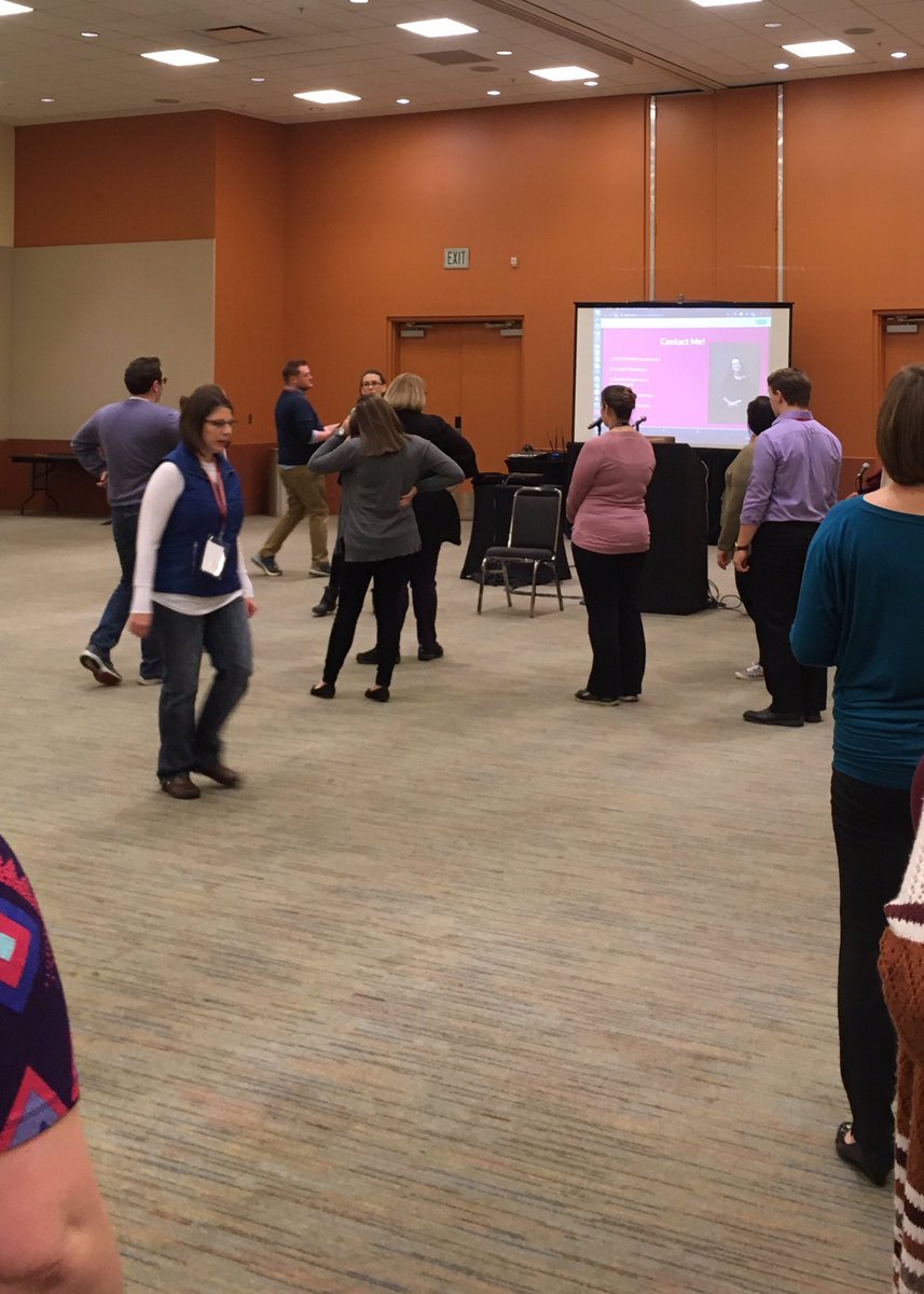 To get me moving, I went to this session on “Folk Dancing Tricks from K-6.” Dance is a great way to teach many aspects of music. You can’t tell much from the picture, but we had a great workout, and had FUN!