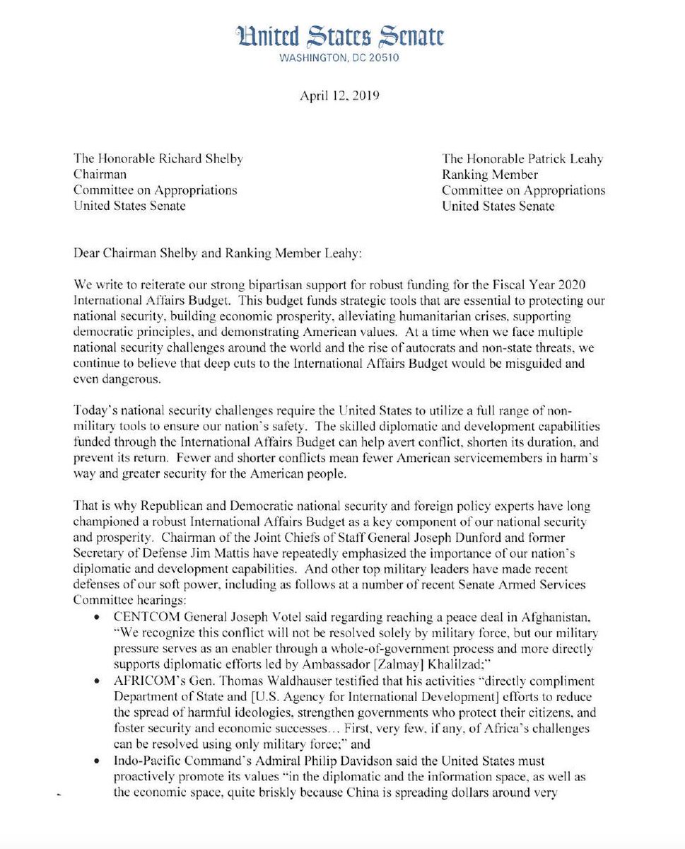 ICYMI: In the face of massive proposed cuts by the Trump Administration to the International Affairs Budget, half of the US Senate just signed a letter reiterating strong bipartisan support for a robust International Affairs Budget. https://s3.amazonaws.com/one-org/us/wp-content/uploads/2019/04/18143538/FY20InternationalAffairsBudgetFINAL.pdf … pic.twitter.com/UM0LvJwaj8