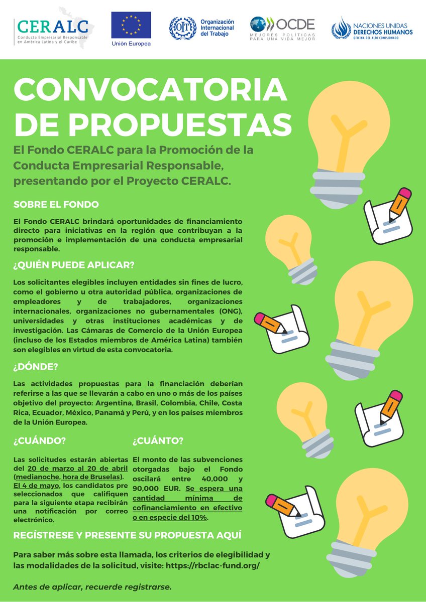📣¡Postula Ahora! El Proyecto #CERALC está recibiendo propuestas que promuevan la Conducta Empresarial Responsable en AL y el Caribe para ser financiadas. ➡ La convocatoria cierra el 20 de abril: https://bit.ly/2WIHL7c  #BizHumanRights @ocdeenespanol @UEnoBrasil @OITAndinapic.twitter.com/dOg06Y5u9M
