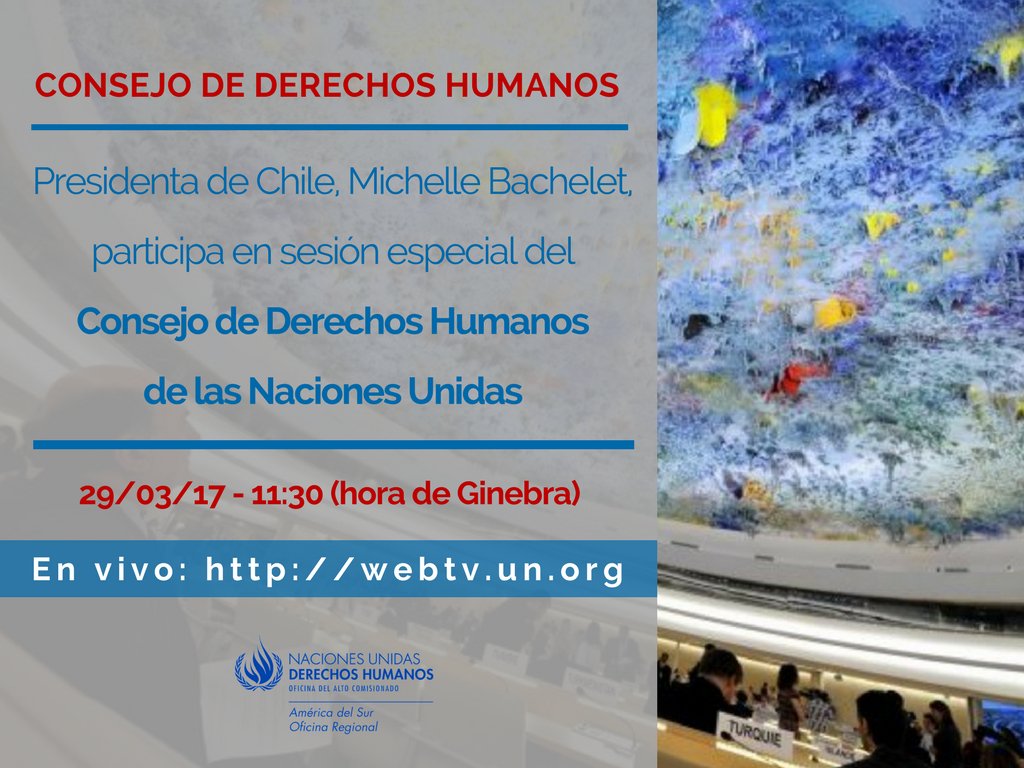 Atención #Chile 🇨🇱: Presidenta @mbachelet participará mañana en sesión especial del Consejo de Derechos Humanos #ONU http://bit.ly/2nxIUg1 pic.twitter.com/ymYix1zIz6