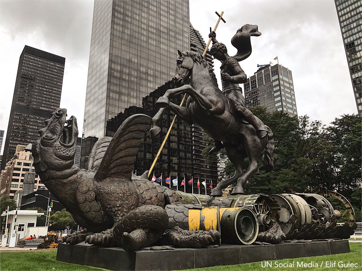 : "El bien vence al mal" es un monumento a la paz instalado en nuestra sede de NYC y compuesto por partes de misiles reales.