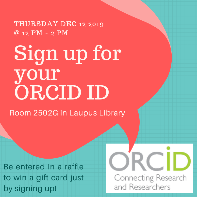 ORCID day is today from 12-2pm in room 2502G of the library! Come get signed up for a free ORCID ID to track your research and publications: