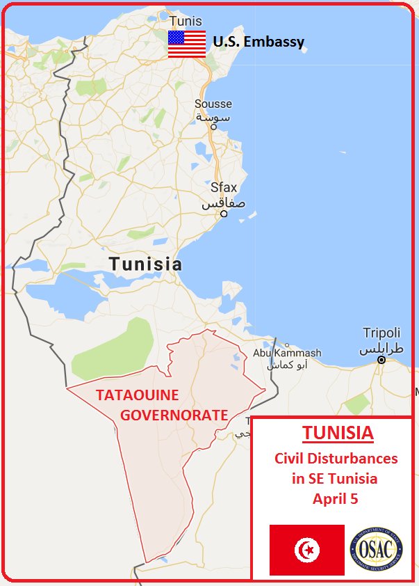 US Embassy #Tunis#Security Message: Civil Disturbances in South#Tunisia https://www.osac.gov/Pages/ContentReportDetails.aspx?cid=21591 …#Tataouinepic.twitter.com/VOH7LqOvJN