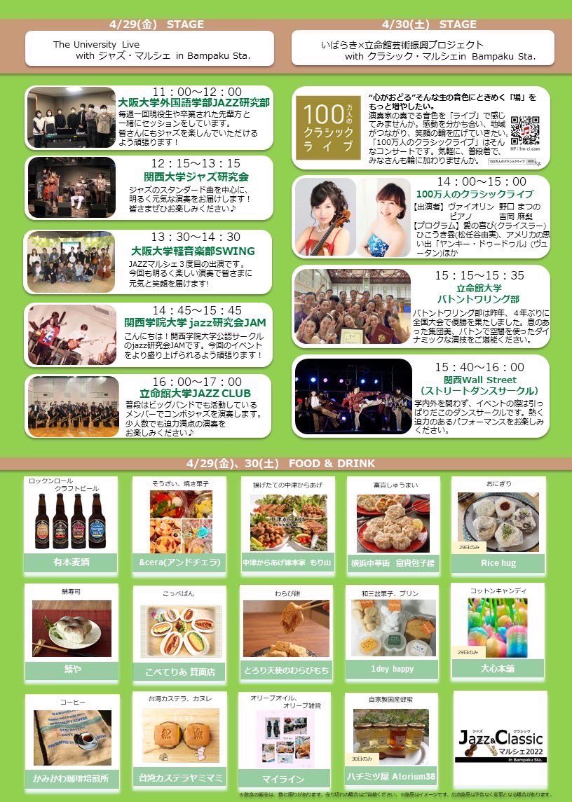 万博記念公園駅で行われるJazzマルシェにコンボで参加させていただきます♪ 場所、日時はチラシに記載の通りです。 ぜひ演奏を聴きに来てください