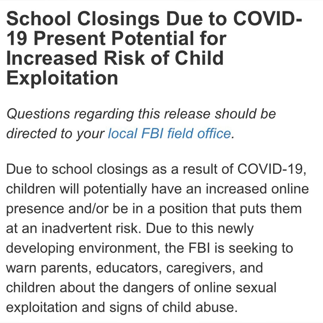 https://www.fbi.gov/news/pressrel/press-releases/school-closings-due-to-covid-19-present-potential-for-increased-risk-of-child-exploitation …pic.twitter.com/6sQOwjdvxP