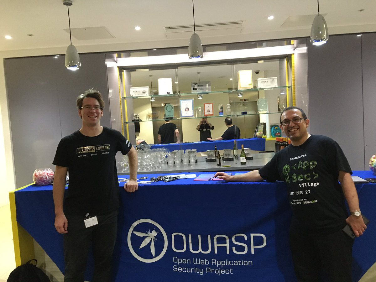 #OWASP booth at BlackHat Europe! Paul Harragan(@theFr0id) , Wojciech Cichon(@wtc), Jim Gumbly(@jgumbley), Jeremy Lawrence, Sam Stepanyan(@securestep9), Grant Ongers(@rewtd):pic.twitter.com/iqTrwQiVBu