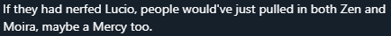 Apart from him thinking running slowly at people without a Lucio would make GOATS work, the fact that he thinks Blizzard overtuning Mercy and refusing to do anything about it for 9 months was "balancing the game around diamond and above"shows how lost the casual community is lmao
