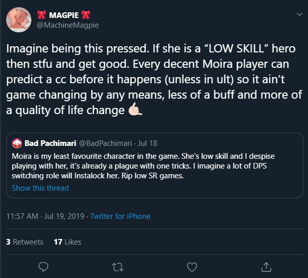 Imagine being this pressed. If she is a “LOW SKILL” hero then stfu and get good. Every decent Moira player can predict a cc before it happens (unless in ult) so it ain’t game changing by any means, less of a buff and more of a quality of life change