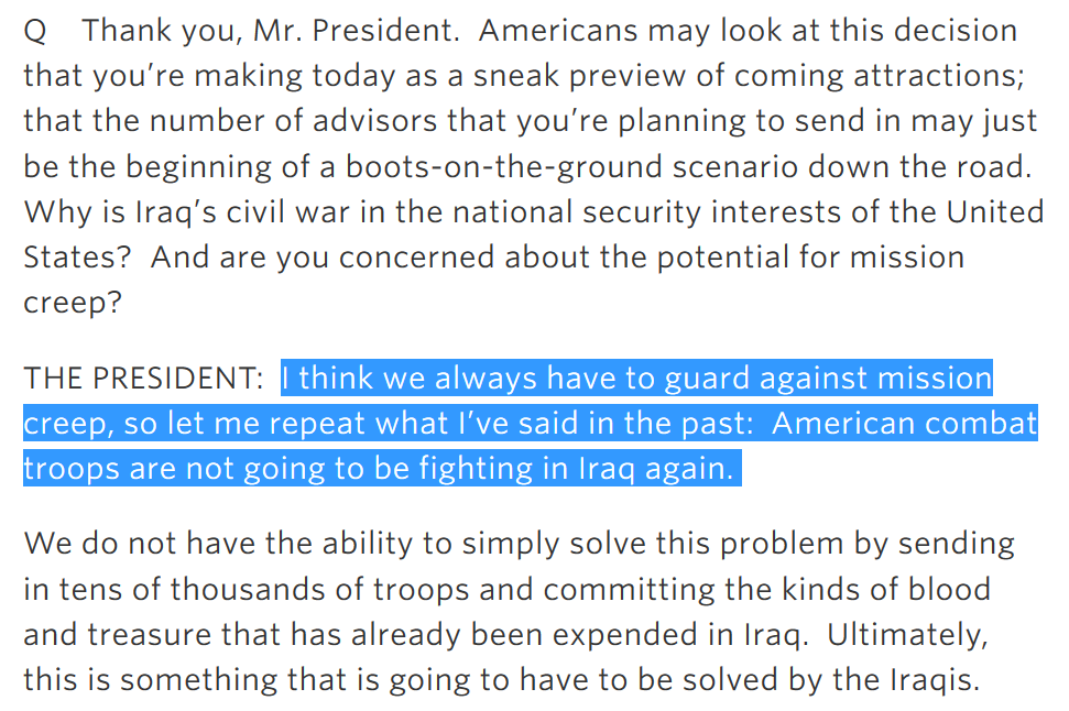 Obama, in June 2014, said "to guard against mission creep." Now he put boots on the ground. https://www.whitehouse.gov/the-press-office/2014/06/19/remarks-president-situation-iraq …pic.twitter.com/w1saMWptru