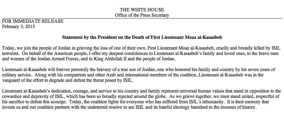 “@WhiteHouse: President Obama on the death of First Lieutenant Moaz al-Kasasbeh." #Diplomacy140