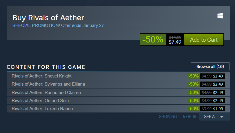 #Genesis7! If you've been looking to pick up Rivals (or any DLC) for yourself or a friend, now's the perfect time to do it with everything 50% off on Steam. https://store.steampowered.com/app/383980/Rivals_of_Aether/ …pic.twitter.com/PjxBkKwK21