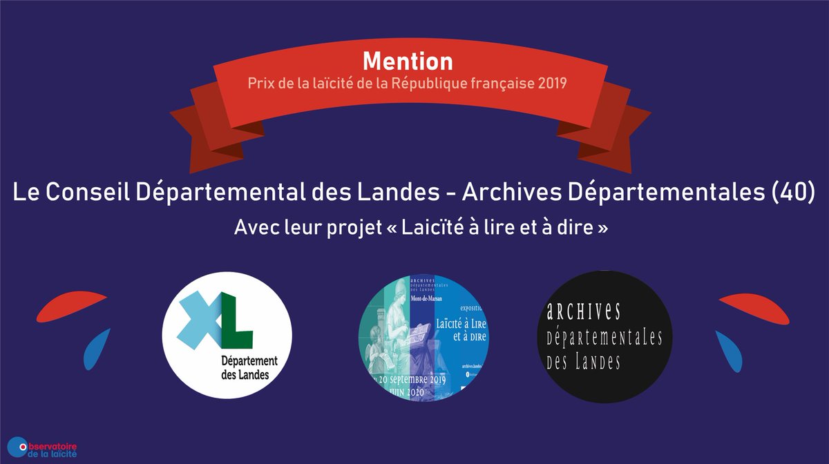 Deuxième mention pour le Conseil départemental et les archives des Landes. Explication de la laïcité auprès des élèves du CM1 au lycée et au travers d'archives, livrets, frises, théâtre, mises en voix, conférences publiques, etc. Travail engagé et prometteur.pic.twitter.com/uguB6y2bCx