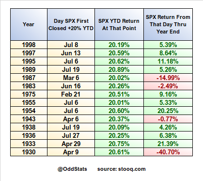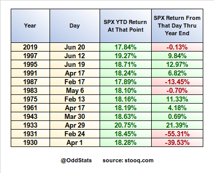 $SPX closed up +17.84% YTD on June 20. Got me wondering if this was the earliest in a year we'd gotten that high before. It is not, but it is the earliest in 22 years. Anyway, it's got zero edge for either camp rest of the year.pic.twitter.com/jxEXjGtBab