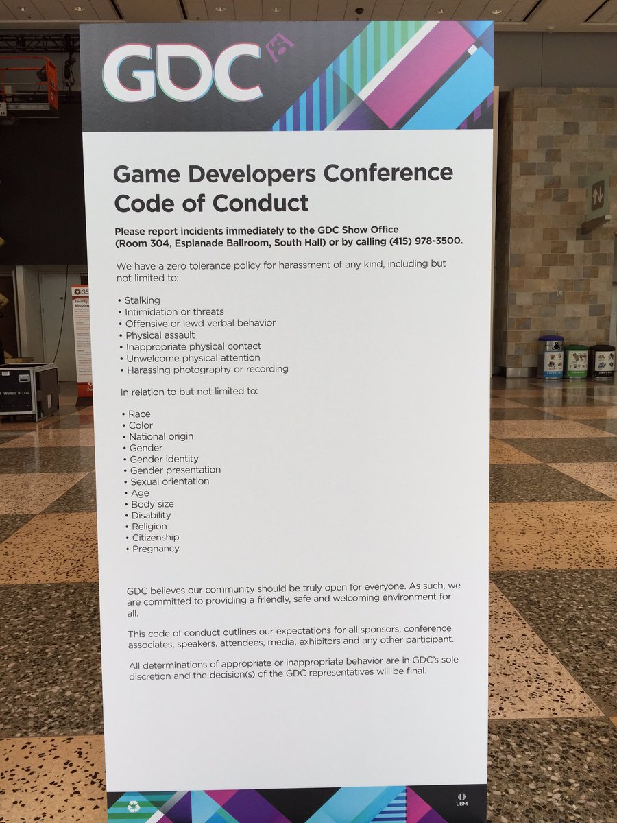 #GDC16 As we get started today, a reminder about our code of conduct, seen below:pic.twitter.com/aEvuHbzzBf