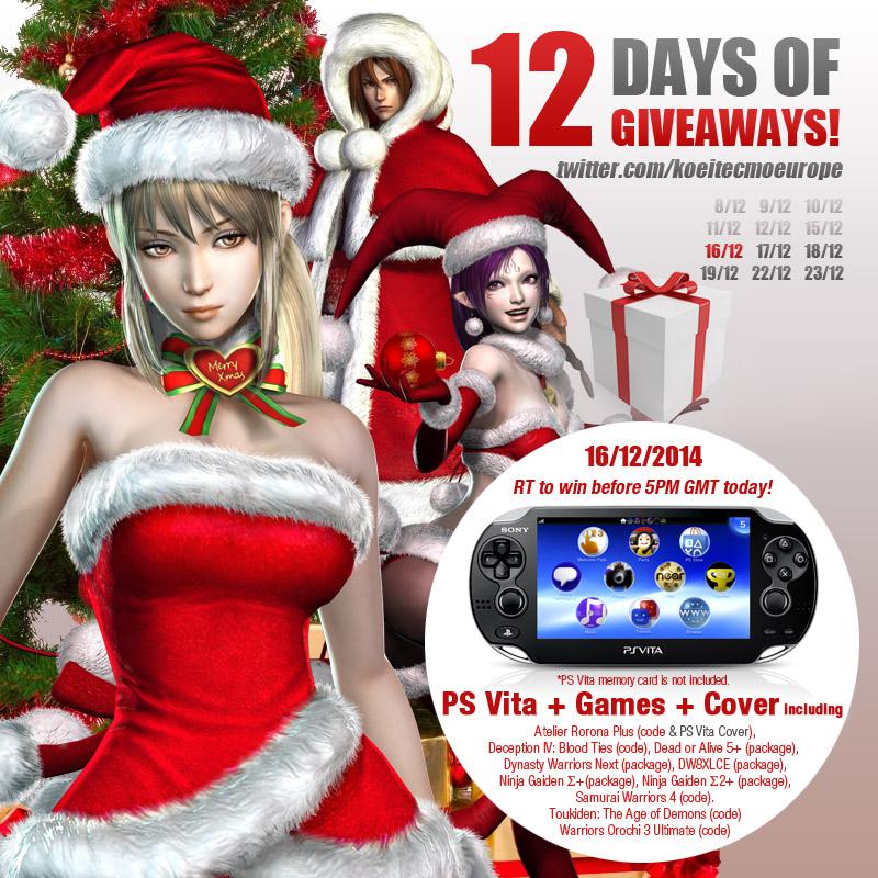 #12DaysOfChristmasGiveaways (16/12). RT to win a#KoeiTecmo set of#PSVita bundle before 5PM GMT today.#KTfamilypic.twitter.com/4HQI64zbLS