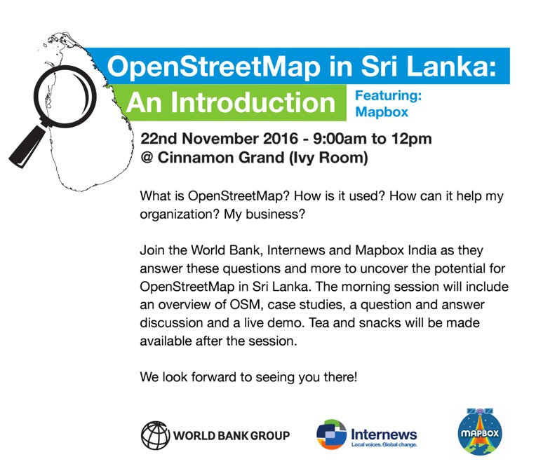 @Worldbank,@internews & us in Colombo on Nov 22 to talk#OpenStreetMap for business & humanitarian! http://tinyurl.com/osm-SrL pic.twitter.com/yXV8KAkP4S