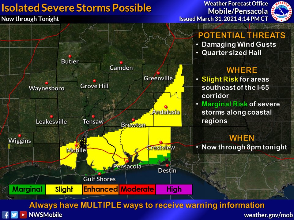 The threat of severe thunderstorms will continue over portions of southwest AL and the Western FL panhandle late this afternoon & early evening. The Severe Thunderstorm Watch continues for Crenshaw county of southwest AL continues through 5 pm CDT, but this watch will be (1 of 4)pic.twitter.com/xu0VE5KC2Y