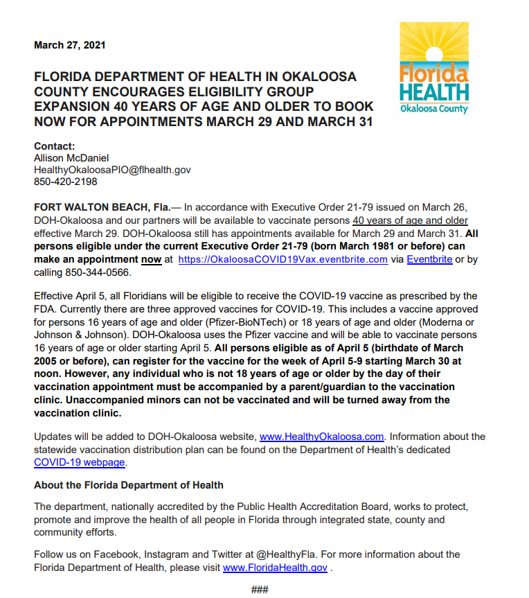 FLORIDA DEPARTMENT OF HEALTH IN OKALOOSA COUNTY ENCOURAGES ELIGIBILITY GROUP EXPANSION 40 YEARS OF AGE & OLDER TO BOOK NOW FOR APPOINTMENTS MARCH 29 AND MARCH 31 All persons eligible under Executive Order 21-79 can make an appointment at http://OkaloosaCOVID19Vax.eventbrite.com or 850-344-0566pic.twitter.com/0X4KkVttrU