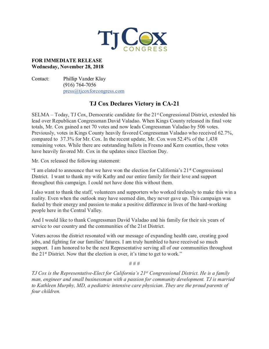 #CA21, I am truly honored to be your next Representative. See my statement below:pic.twitter.com/VGpzrbBkW5